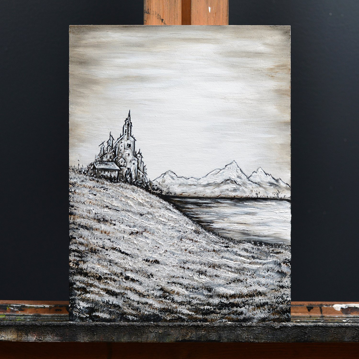 This sepia-toned original oil painting of a grassy landscape with water, snow capped mountains, and an old castle in the distance is hand-painted on a 3/4 inch thick cradled wooden panel. The sides of the panel were painted a sepia brown with raw umber oils.